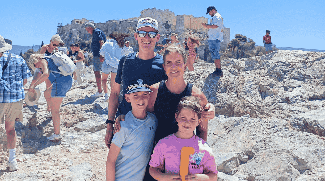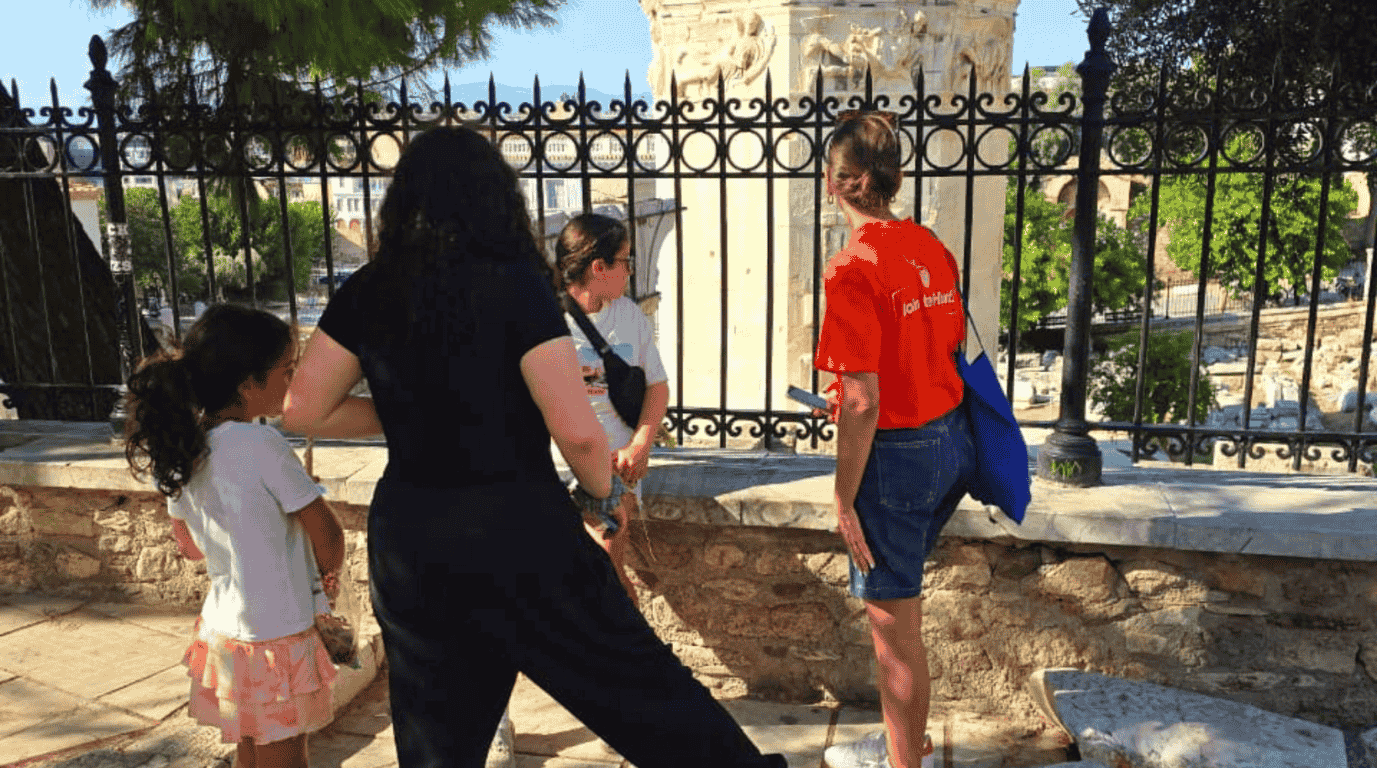 Find your facilitator near the Αrch. They will be wearing a blue t-shirt with the Goddess Athena or God Poseidon printed on it, making them easy to spot.